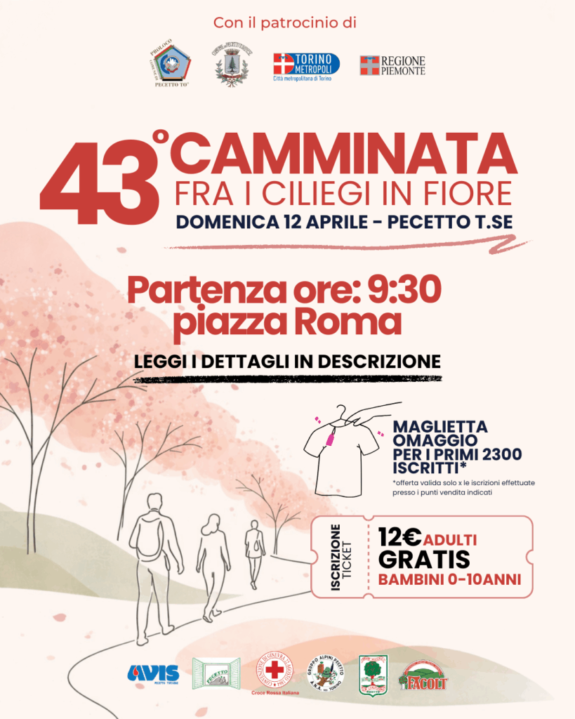 Dieses Jahr findet die Wanderung unter den blühenden Kirschbäumen in Pecetto Torinese, in der Nähe von Turin, zum 43. Mal statt – und ich bin nun schon zum vierten Mal unter den Sponsoren der Veranstaltung.