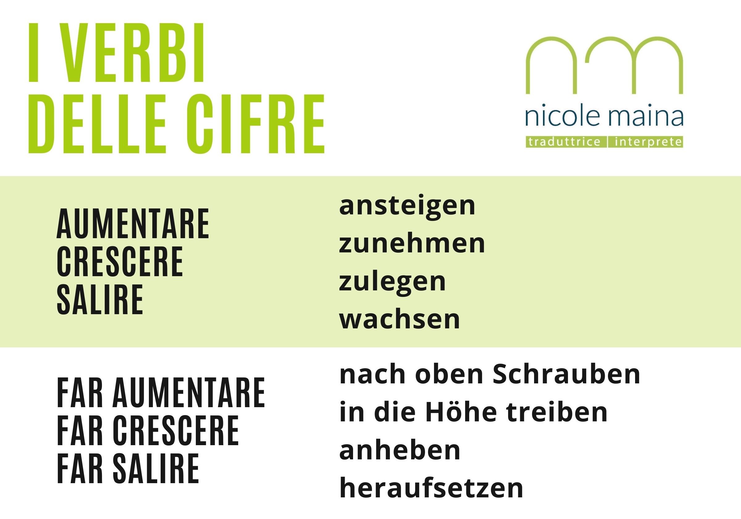 Lavorando come interpreti a convegni e conferenze ci si trova spesso confrontati con le cifre e i relativi verbi, in genere legati ai concetti di “aumento” e “diminuzione”. Ma le accezioni possono essere molte, e soprattutto non si può passare una giornata intera a tradurre con “sta aumentando” o “è calato”.